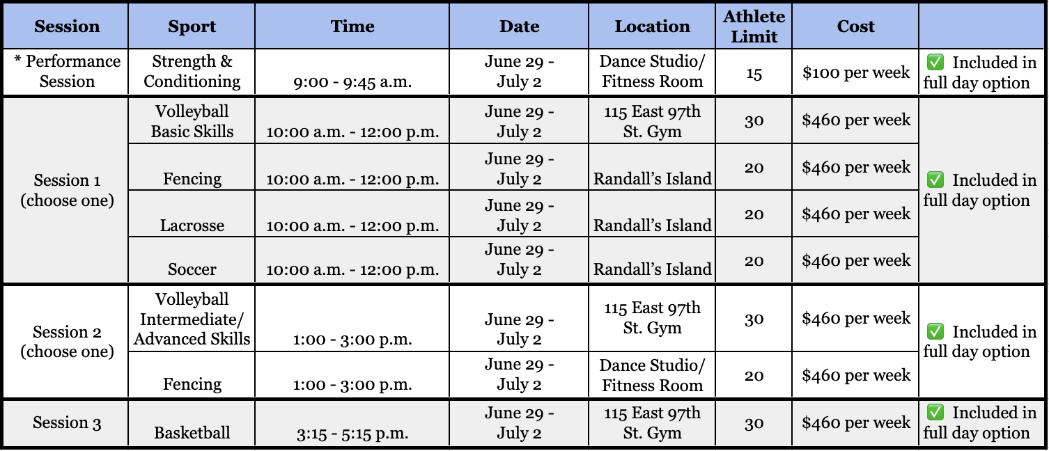 - Half-Day Experience (includes any two sessions, excluding performance session): $850 per week