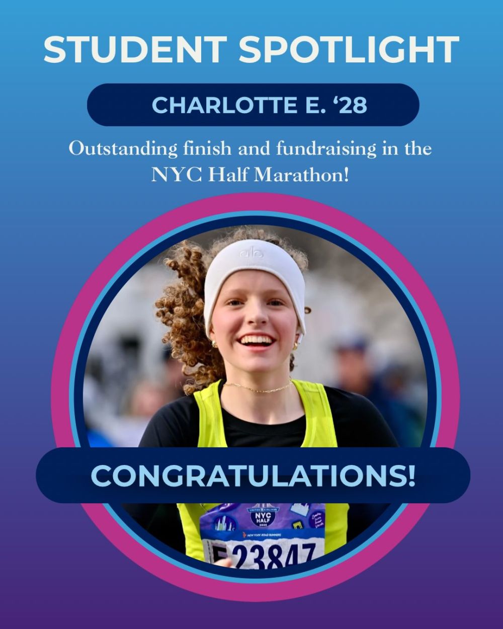 Congratulations to Charlotte E. โ28, who completed the NYC Half Marathon last weekend! ๐โโ๏ธ๐